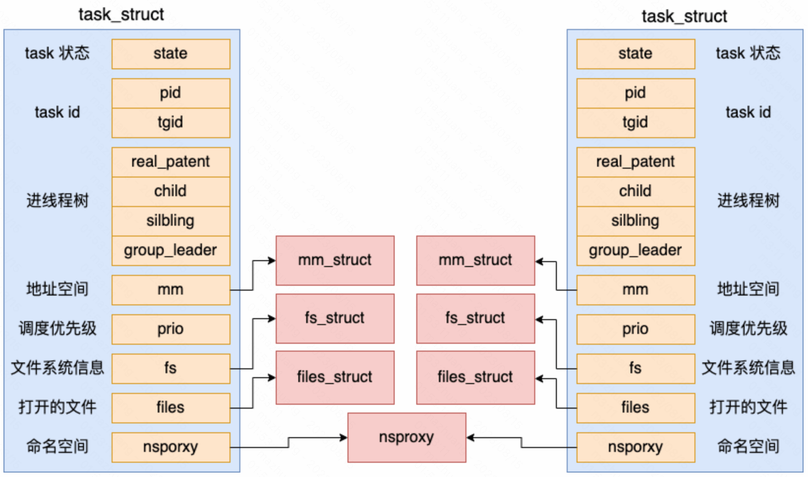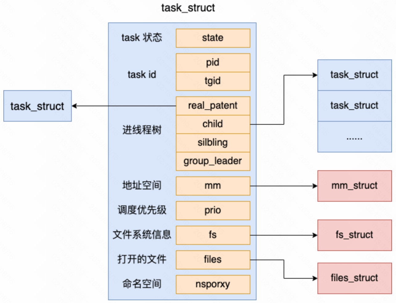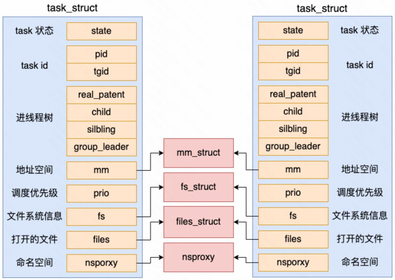 对于线程来讲,所有的字段都是和进程一样的(本来就是一个结构体)。包括状态、pid、task 树关系、地址空间、文件系统信息、打开的文件信息等等字段,线程也都有。