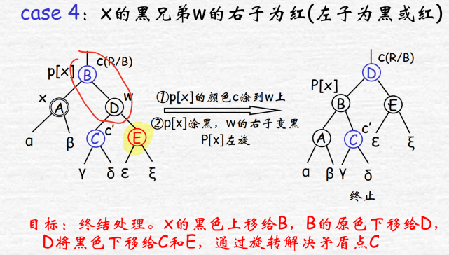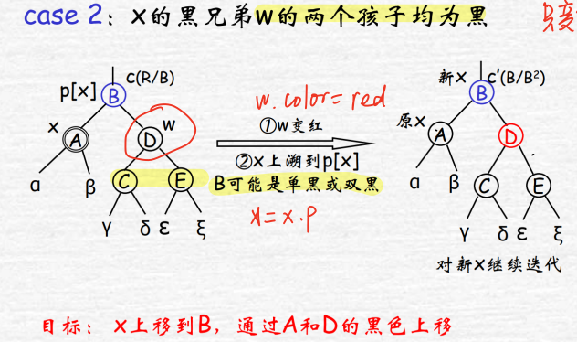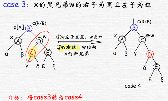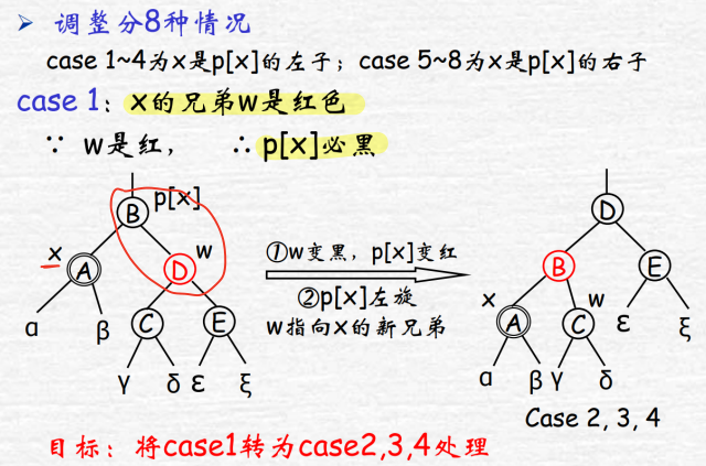 考虑x为左子节点时,兄弟结点w,分为四种情况: