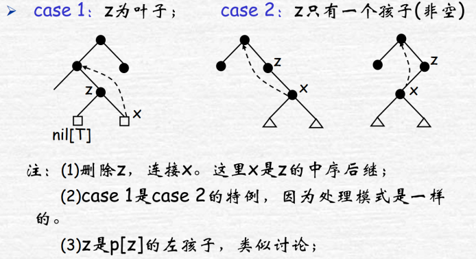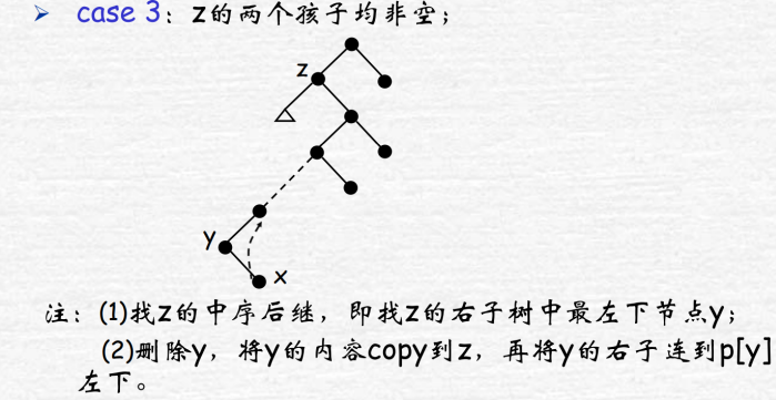 删除:z为子节点直接删,有一个子节点则让子节点取代,两个子节点则用中序后继节点y取代自己(右子树最左的结点y,覆盖z的值),此时实际转为删除y,让y的右子节点x取代y