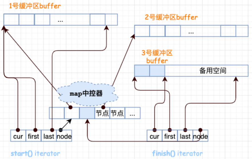 迭代器:Deque用 start 和 finish 两个迭代器指向首尾两端的连续空间。每个迭代器包含4个指针:first、cur、last指向缓冲区中,node二级指针是map中指向当前缓冲区指针的指针