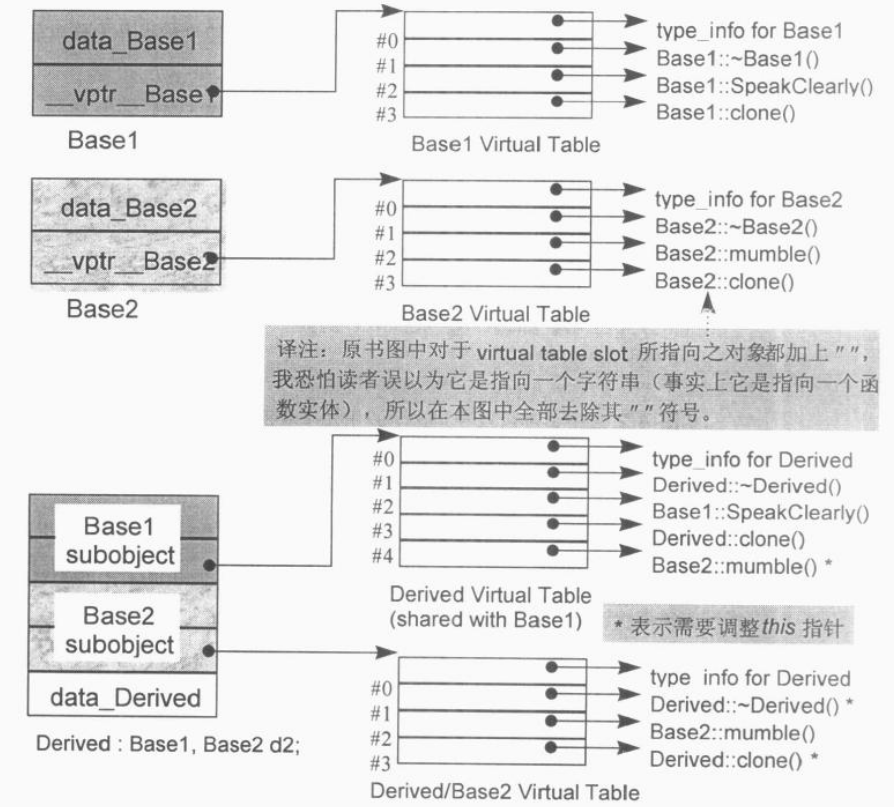 (*ptr->vptr[(int)pmf])(ptr); - 对一个”指向member function的指针”求值,由于该值有两种意义,其调用也将有别于常规操作
