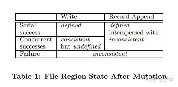 数据的修改分为:写入Write和记录追加Record Append。其结果有:顺序写入成功Serial success、并发写入成功Concurrent successes、写入失败。两种写入方式,三种写入结果,那么数据就会有不同的状态,GFS使用“确定的defined”和“一致的consistent”在标识数据的状态。怎么理解呢?