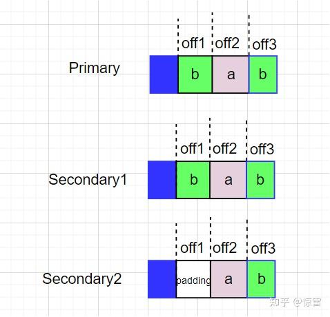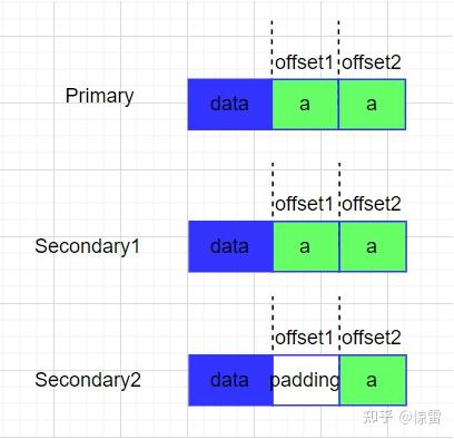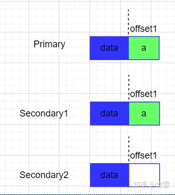 于是,客户端重新发起一次追加写操作,Primary先操作offset2后再将请求发给Secondary操作offset2,由于Secondary2上次操作offset1未成功,所以会先补空数据,然后再从offset2处写数据,那么此时副本情况如下: