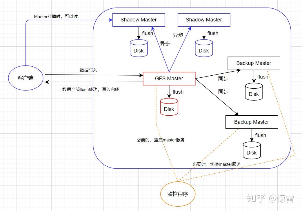 实际上,Shadow Master为了保持自身状态是最新的,他会读取一份当前正在进行的操作日志副本,并依照跟Master完全相同的顺序更新内部数据。Shadow Master在启动时也会从Chunk Server服务器上轮询数据(之后定期拉数据),数据包括副本的位置信息。Shadow Master也会定期和Chunk Server服务器“握手”来确定他们的状态,只有在Master节点因为创建和删除副本导致副本的位置信息变化时,Shadow Master才和Master通信更新自身状态。通过Backup Master和Shadow Master,GFS构建了高可用(HA)架构。