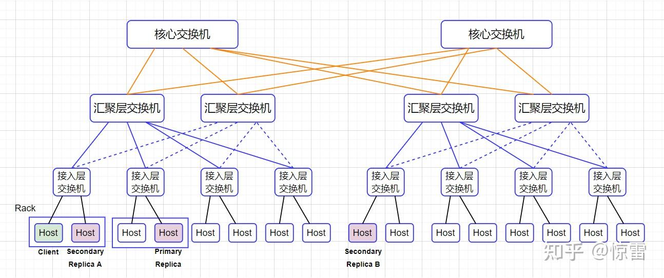 这里有个问题:为什么要强调客户端 ”先把数据传输到离自己网络最近的次副本Secondary Replica A上”,而不是直接发送给主副本Primary Replica呢?我们看下这张传统三层交换的数据中心网络拓扑图就明白了。