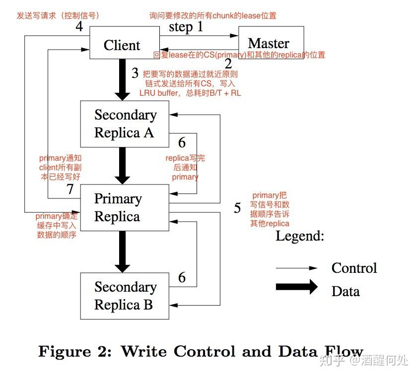 - 客户端拿到副本位置信息后,即:应该写入哪些ChunkServer里,客户端会把要写入的数据发送给所有副本。此时ChunkServer把接收到的数据放在一个LRU缓存中,并不真正地写数据。